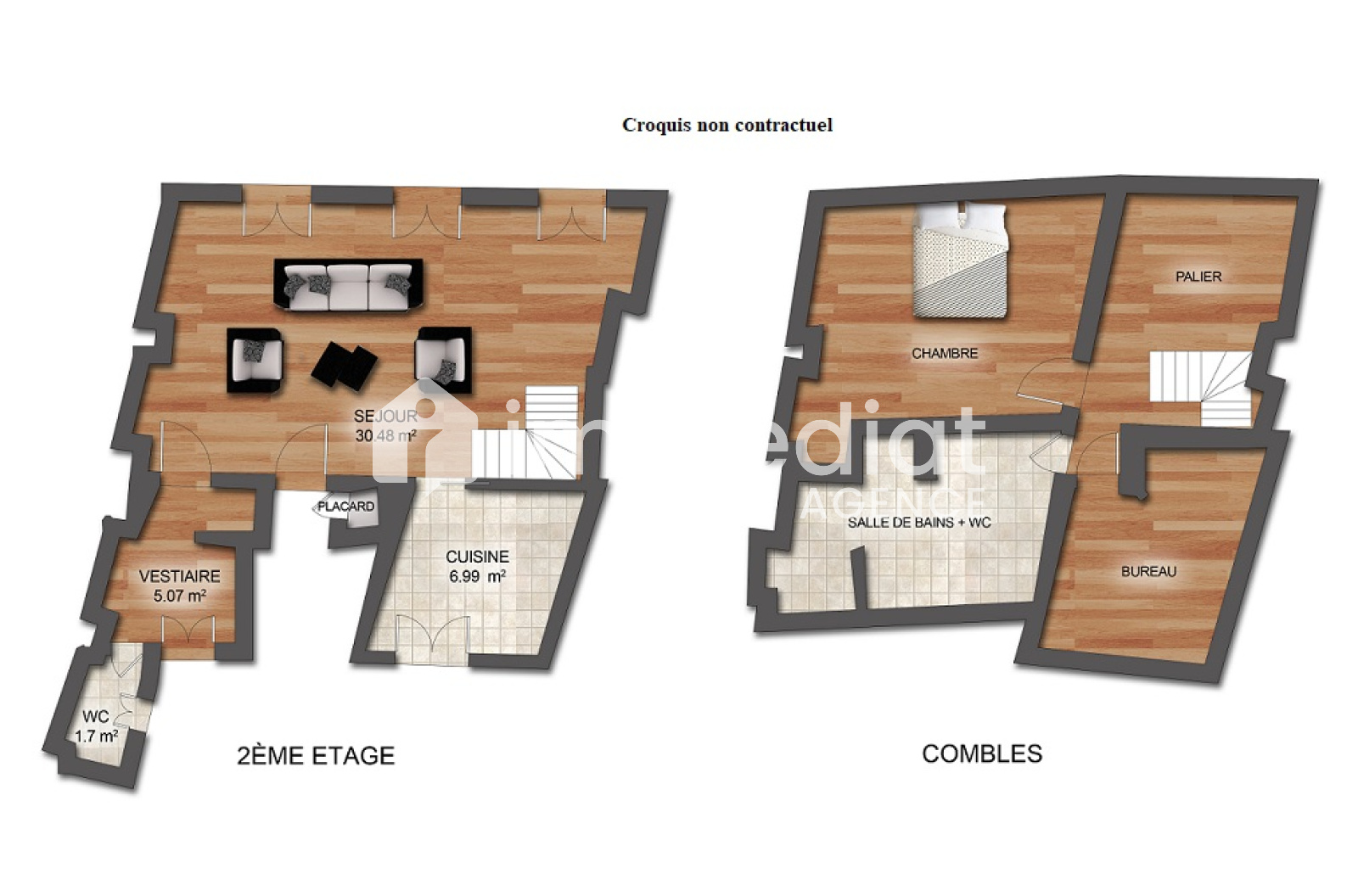 A l'étage, sous combles aménagés, deux espaces réservées aux chambres, un coin jeux pour les enfants et une sdb/sde/wc.